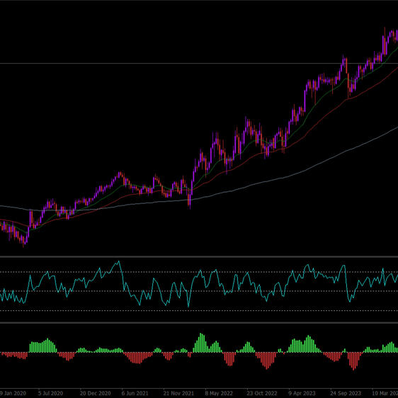 Why is is down, because the yellow 5 EMA has crossed the red 13EMA down and because the RSI is below 50% midline. Also the structure has changed to lower lows and lower highs and price is below all the moving averages.