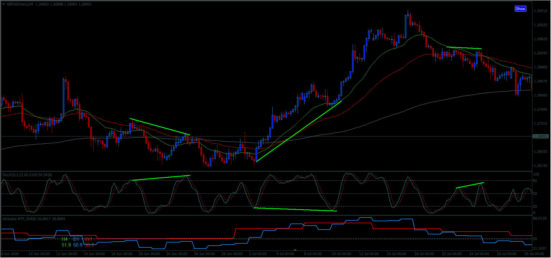 Identifying discrepancies - A divergence is a situation where the oscillator behaves differently from the price of a currency pair or asset. These descrepacies are called divergences. I prefer hidden divergences because they signify movement in the direction of the trend, unlike regular divergences which signify a trend reversal, but I use both.
