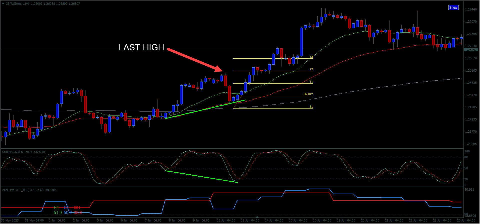 A good trend following strategy requires a trend, a trigger, and a good risk to reward (entry, stop loss and take profit combined).The 200 (EMA or SMA) is a time tested trend indicator used by almost all traders. If the price is above it is in an uptrend, take only buys, if price is beneath, it is in a downtrend, take only sells, on any time frame. The complications occur when one time frame is pointing up and another is pointing down. What is the real trend? Always ensure you are trading in the direction of the higher time frame. My strategy relies on the next higher and next lower time frame are moving in the same direction. That is when you get the highest probability of the trade going in your favor.Each time frame should be separated by a factor of 4 to 6. For example I may choose to trade 3 time frames Day, H4 and H1. There are 6X H4 periods in a daily bar and 4X H1 periods in a 4 hour bar.Mentioned in the strategy above. We need the moving averages in the correct order, hidden divergence and using a lower time frame regular divergence or some of the confluences mentioned in the previous section.The take profit should be to at least the previous low in a down trend or the previous high in an up trend. See below.