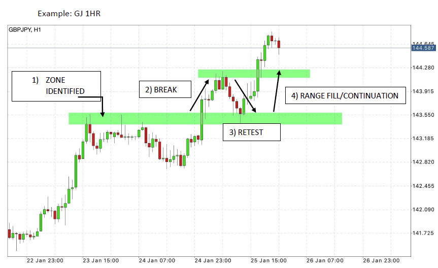 Break and retest of support/resistance.I am always looking for a break and retest of a previous swing high or low and anticipating retest. Eample in the screenshot below.