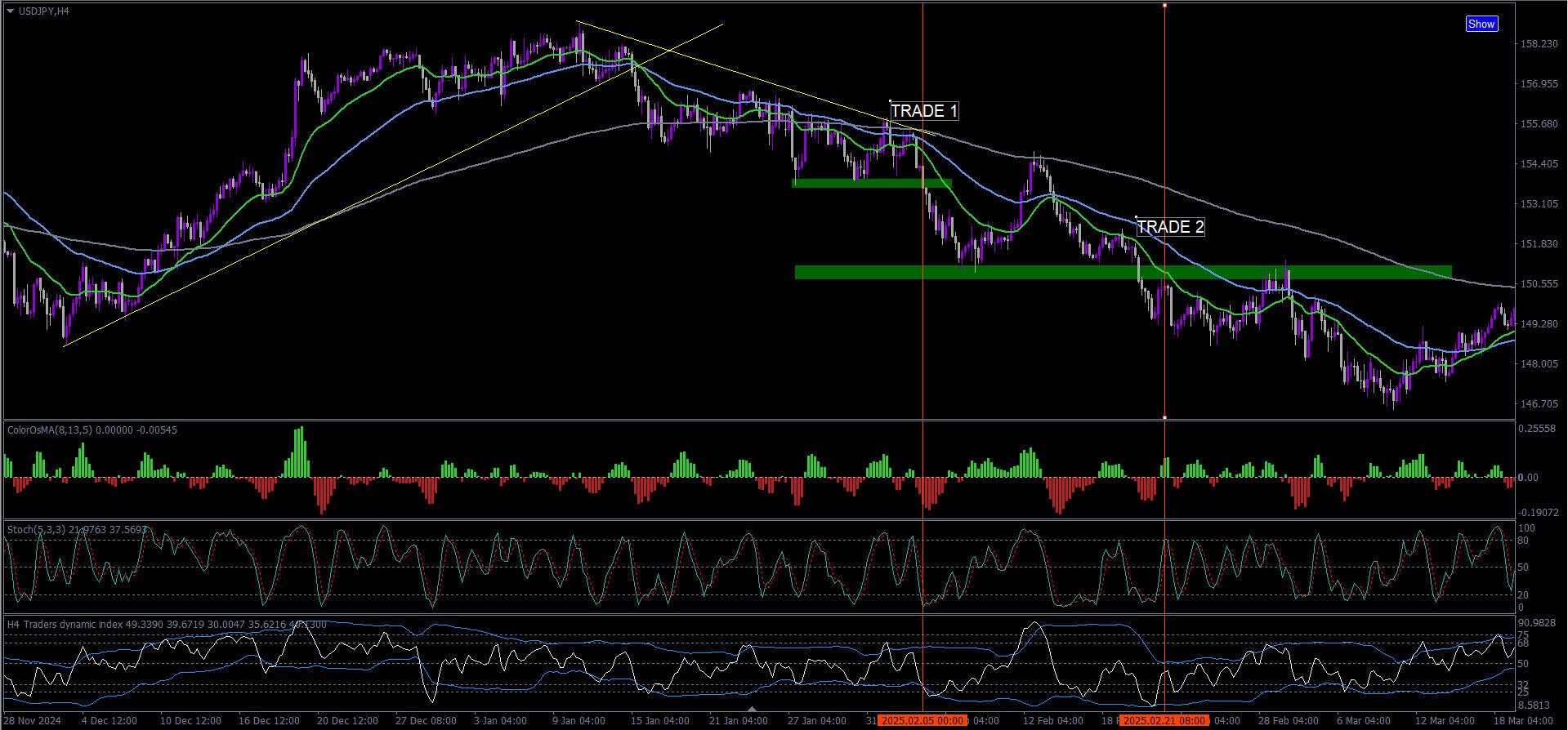 Next screenshot shows two trades, one and two which I will explain in greater detail. They are the classic break and retest types of trade which I look for. Both of these are with the trend, moving averagers in correct order on the next higher time frame and the next lower time frame.