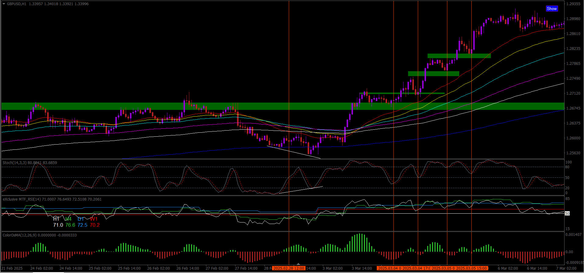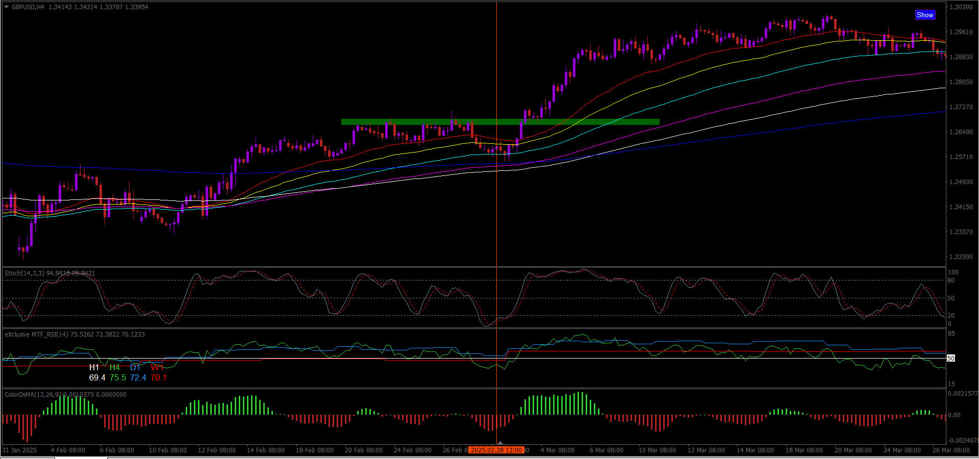 Multi time frame RSI with period 8, Daily and Weekly (See 'Downloads').On the H4 time frame, wait for cross over of the 20/50 above/below the 200. Then take the first or second pullback of the stochastic which crosses the 50%. This is especially good if you have hidden divergence as shown below but also without. Moving averages in order and the multi time frame RSI must be above the 50% for a buy or below for a sell.Check one time frame higher if the moving averages are in order. Check one time frame lower if there is regular divergence, then better and and the moving averages are also in order.